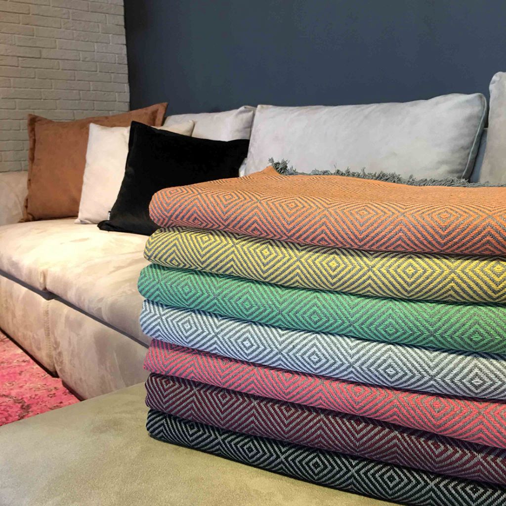 A soft rhombus designed blanket for all seasons. Bundle up in the blanket in your bedroom on a chilly evening, use it on a garden swing, or show it off as a sofa throw for the living room. Using weaving techniques for peshtemals, the Carré blanket is woven on semi-automatic looms and exudes boho vibes with its rich colours. Its thin, space-saving fabric makes it the best beach blanket to dry in or sit on for picnics. It also makes a great Christmas or Mother's Day gift!