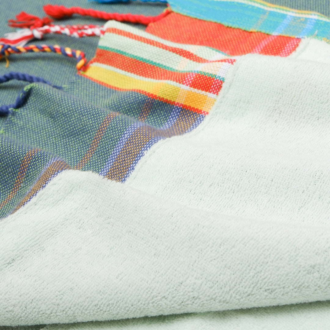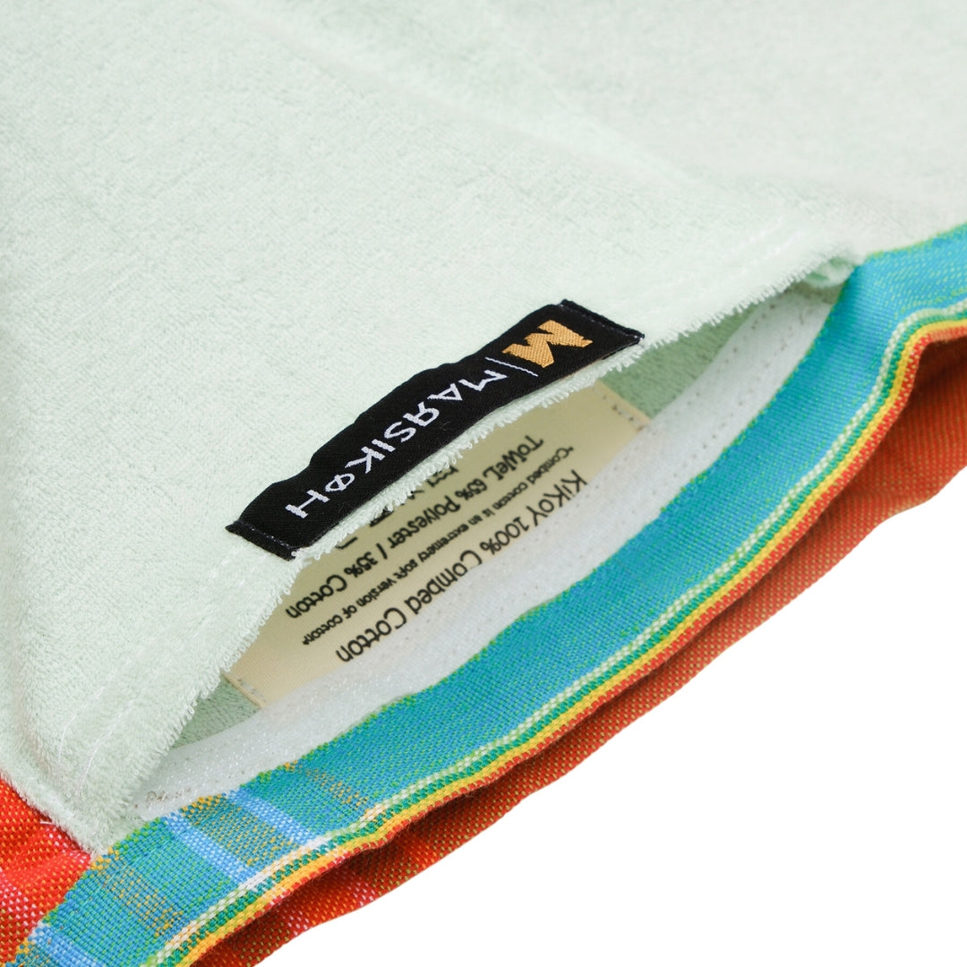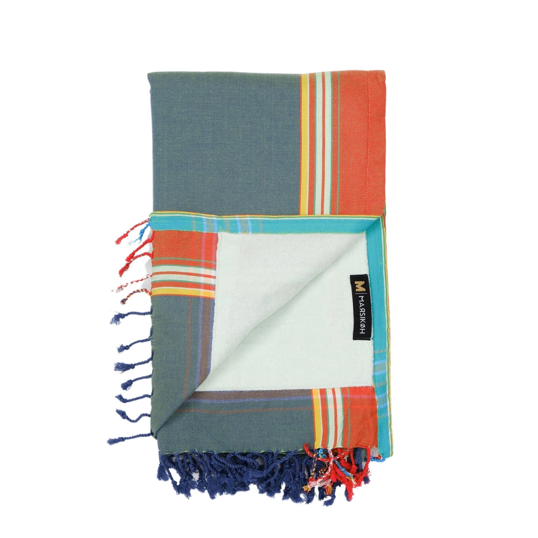 Our Siracusa Kikoy is a chic and practical bath sheet made in Kenya. This Kikoy-towel is a beautiful blue combed cotton fabric for comfort, on the other side terrycloth to dry yourself off after a day at the beach or sauna. With a velcro pocket to store valuables, you can really get creative with this traditional East African fabric.