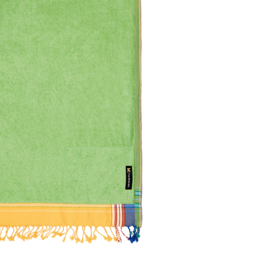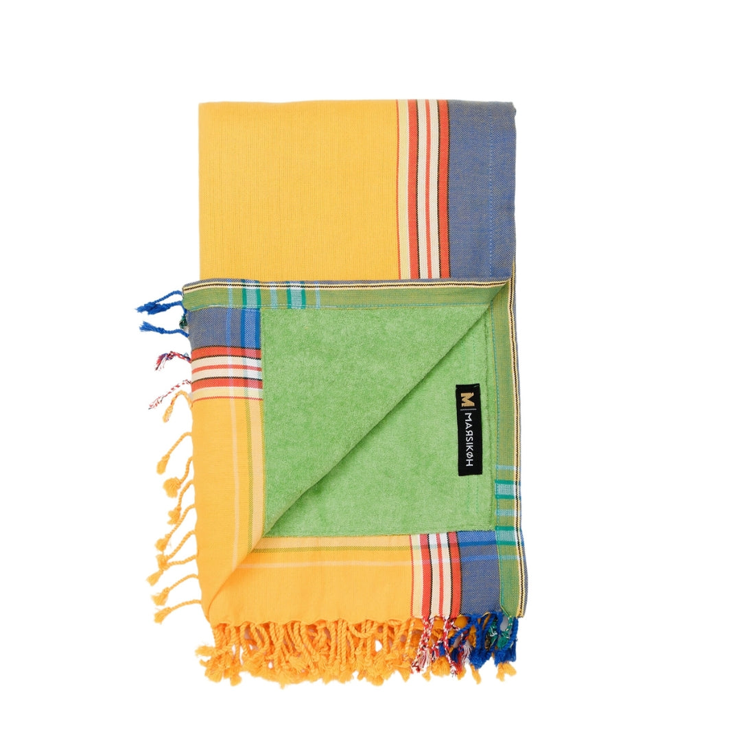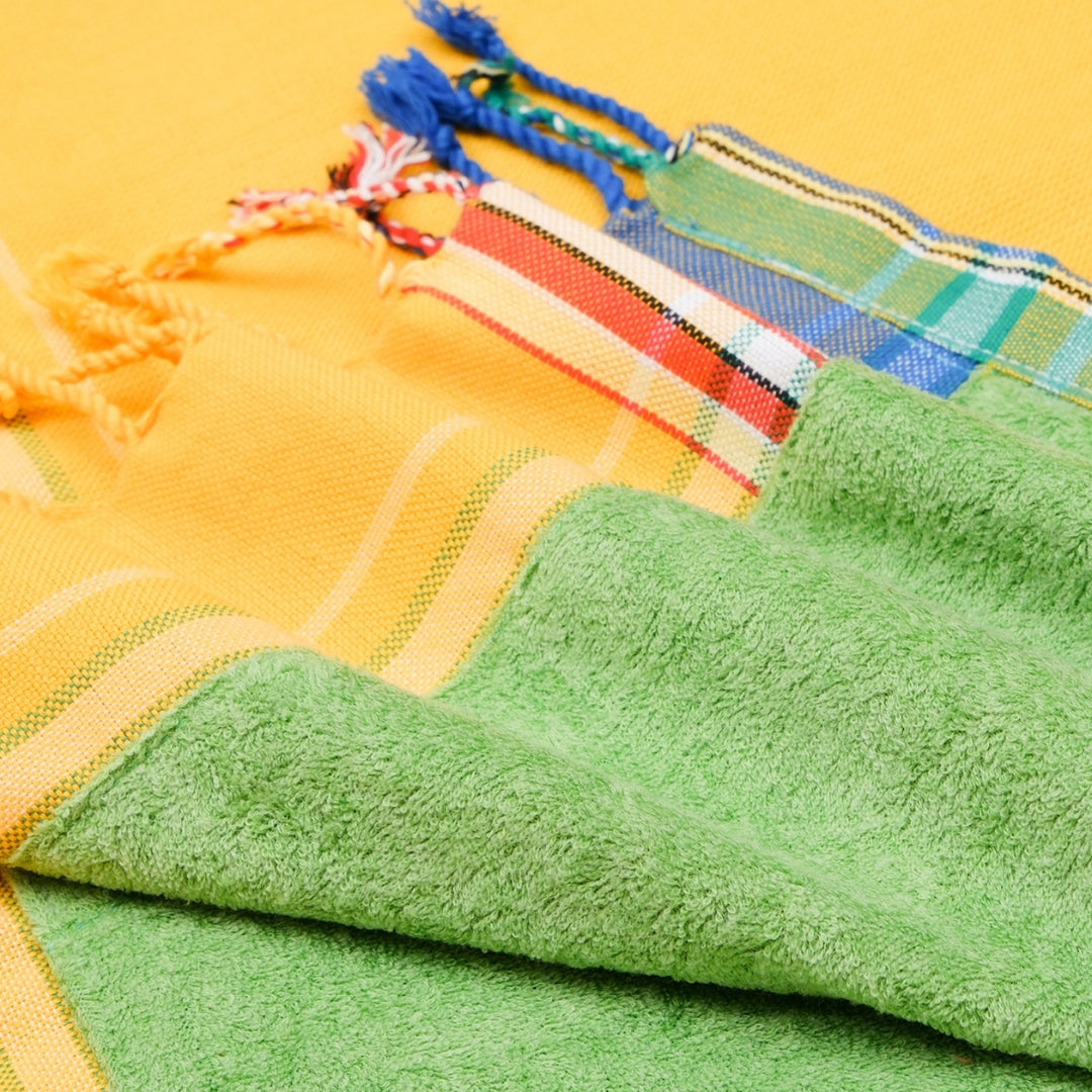 Our Sorrento Kikoy Towel is a gorgeous bright yellow and green that stands out amongst the rest. Versatile and fashionable, this Kikoy-towel can be used in a variety of practical ways. Use the traditional cotton side to use as a beach blanket, yoga blanket, and more. The other side is terrycloth so you can dry yourself off after a refreshing swim or bath.