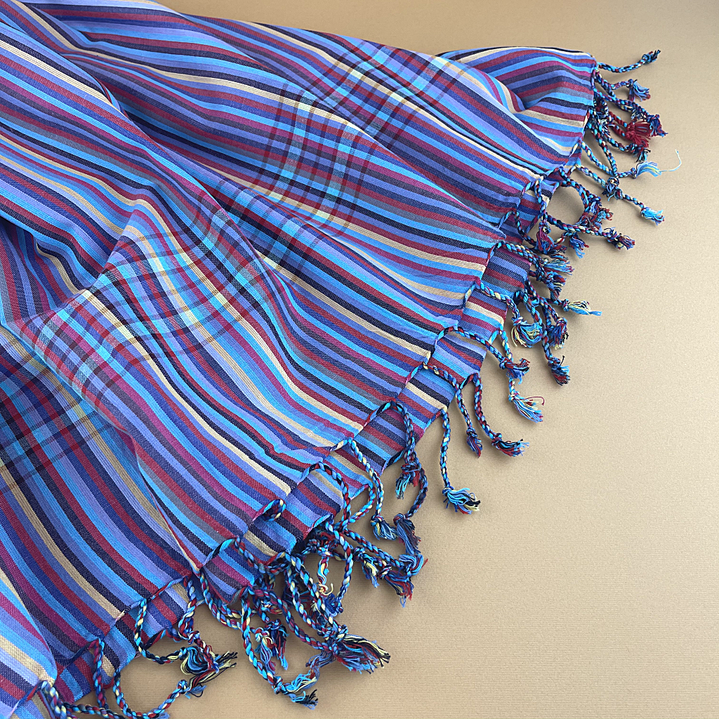 Our Lisbona Pareo stands out amongst our other Soft Kikoy styles with its colourful cool-tone striped pattern that gives it a fun and fresh characteristic. This garment is especially fitting for an outdoor adventure! Bring this soft and lightweight Kikoy to the beach or a picnic and you will find endless uses such as a blanket, sun shield, or fashion cover-up.