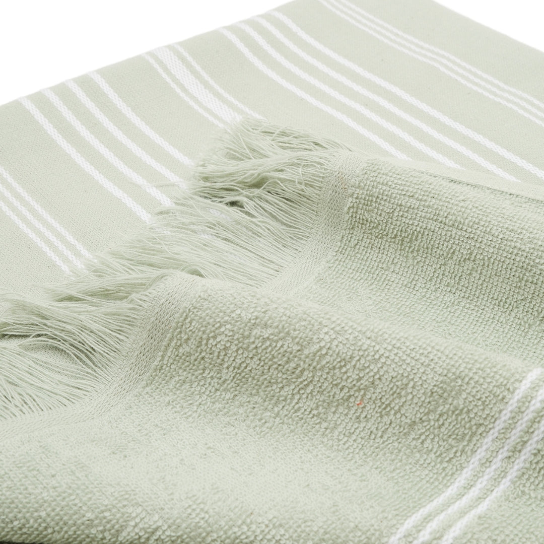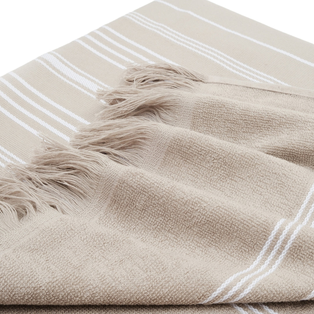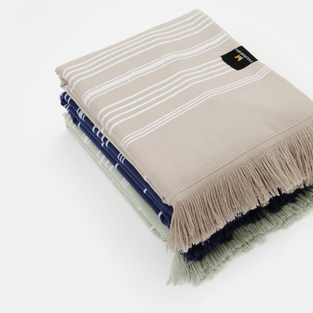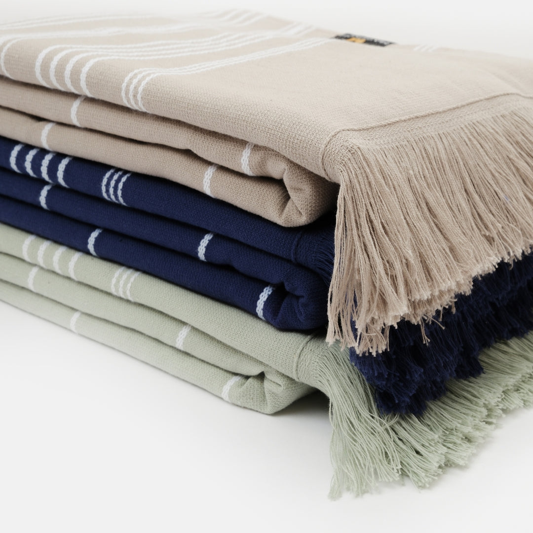 A peshtemal towel with terry fabric on one side and a plain weave on the other. Its vibrant, colours and striped design gels well with any bathroom decor. Its lightweight and compact size makes for a convenient carry-on when traveling by plane or foot.