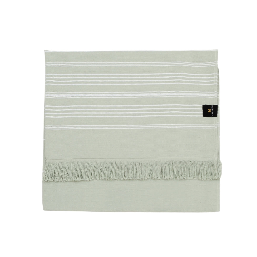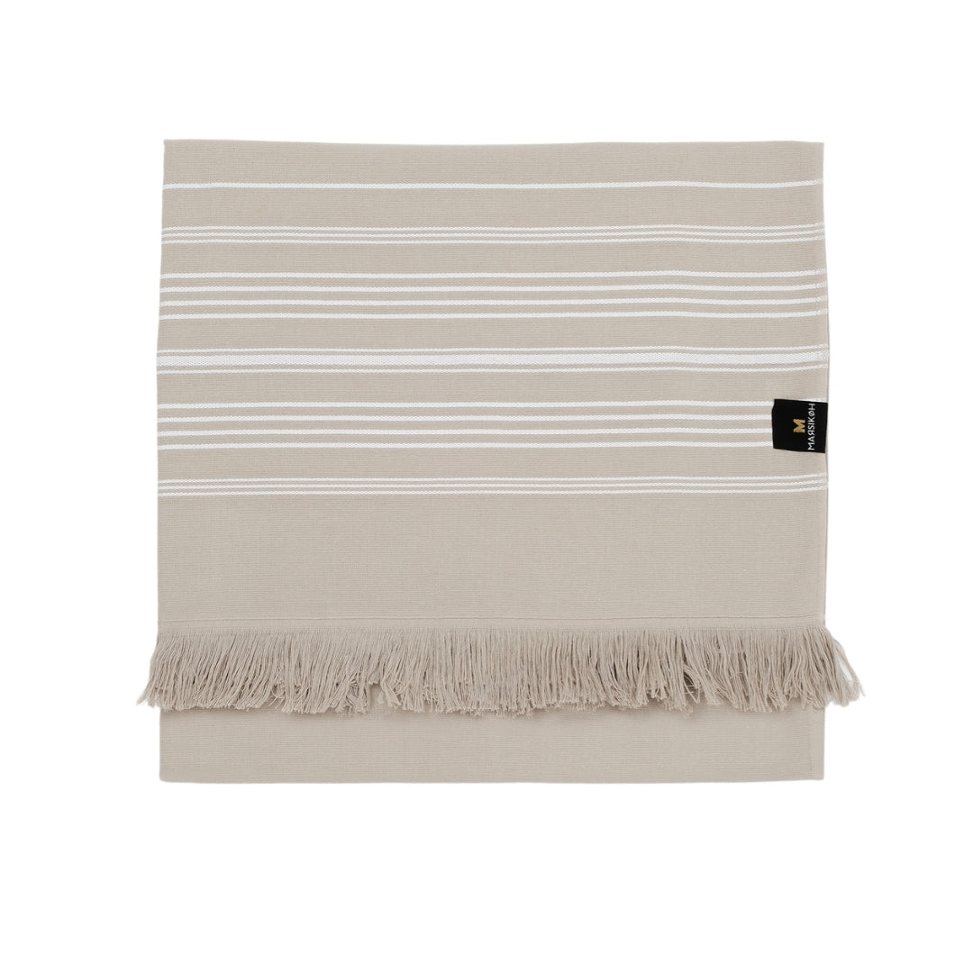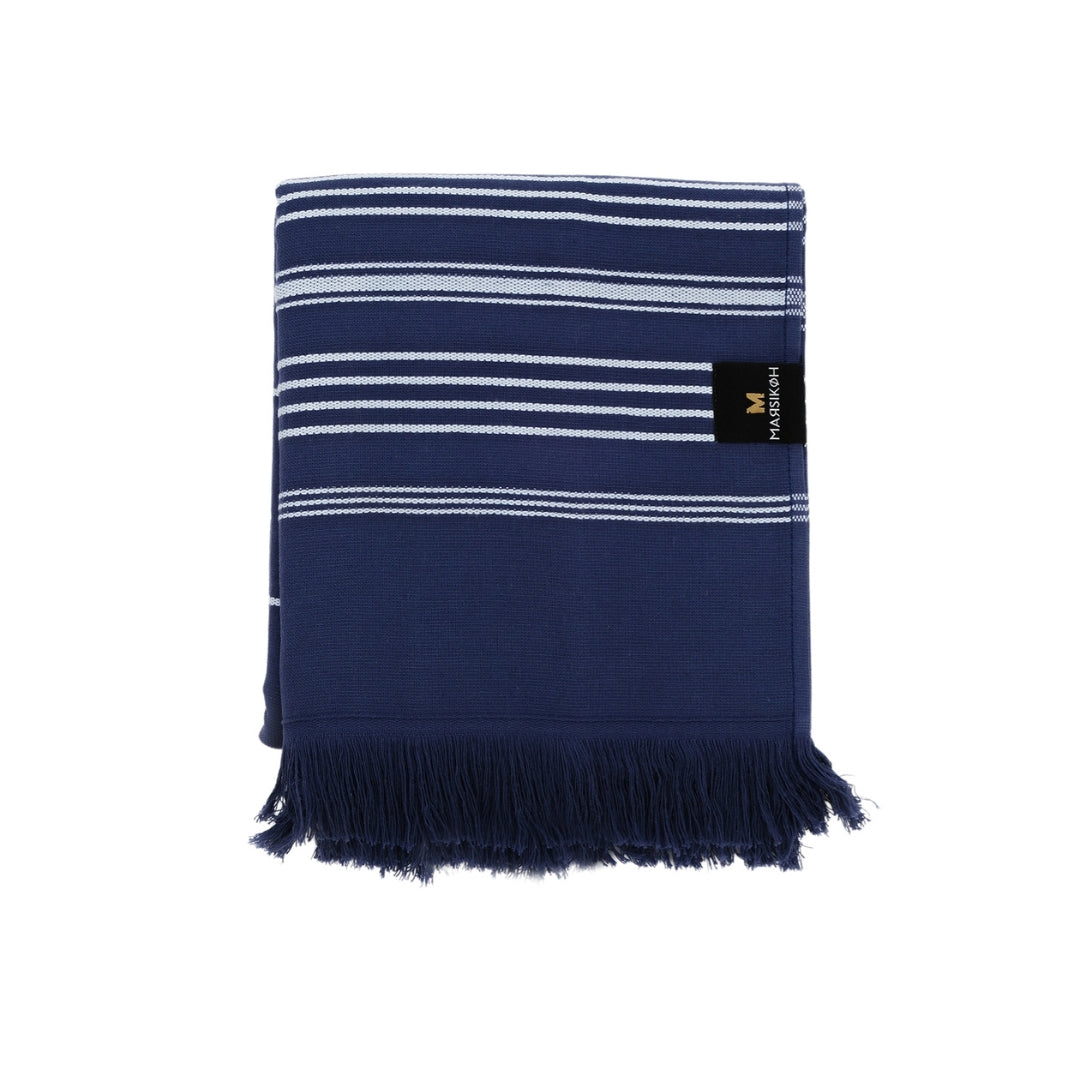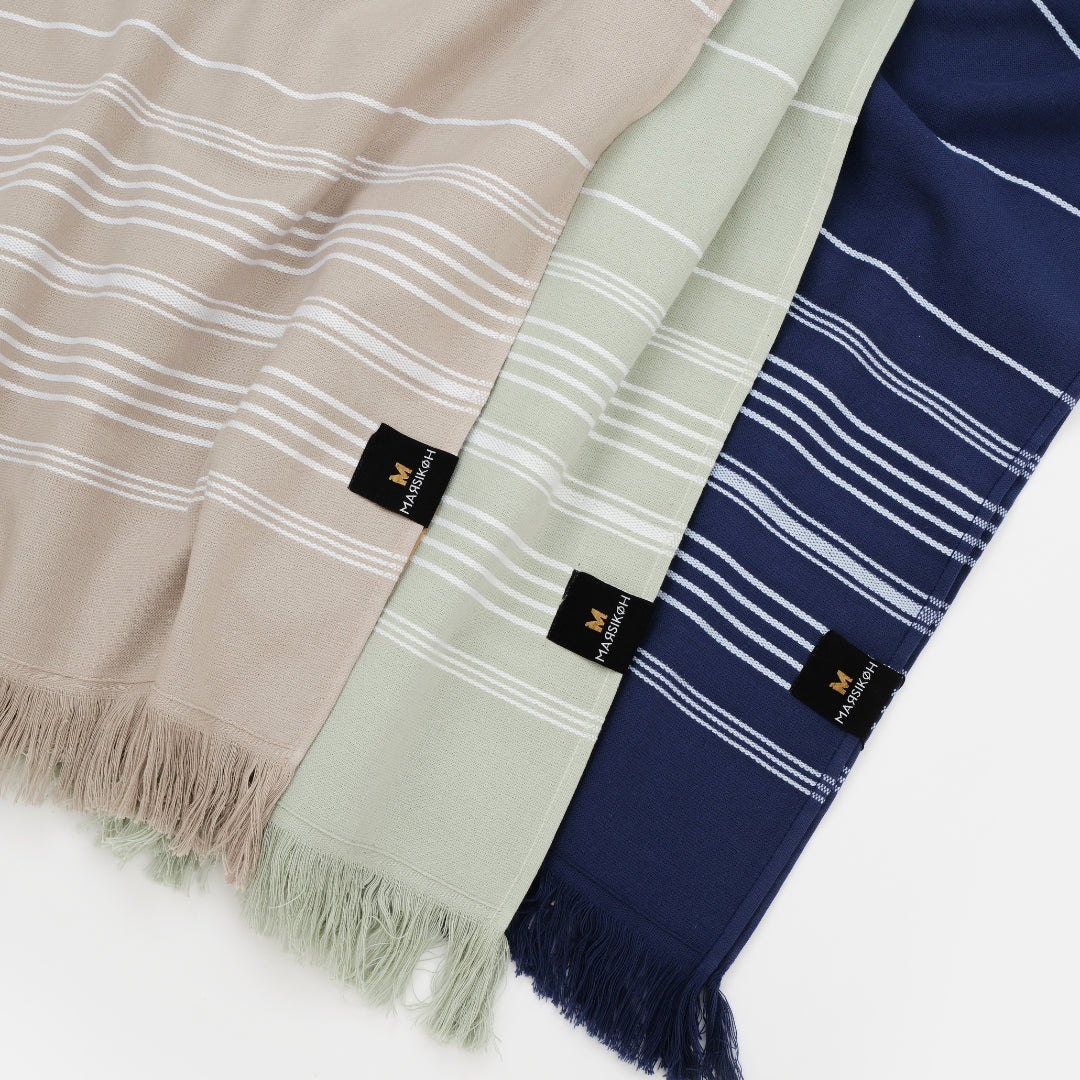 A peshtemal towel with terry fabric on one side and a plain weave on the other. Its vibrant, colours and striped design gels well with any bathroom decor. Its lightweight and compact size makes for a convenient carry-on when traveling by plane or foot.