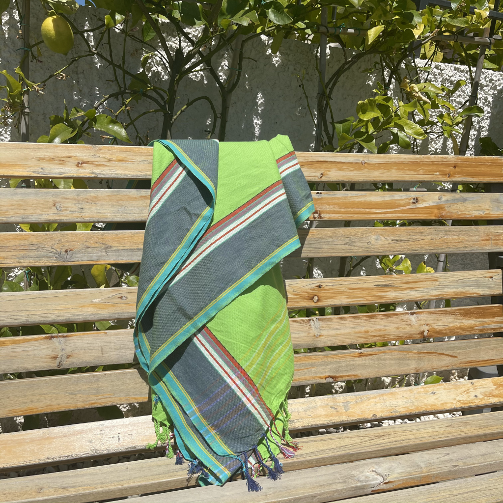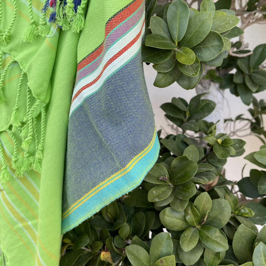 Our Santorini Kikoy with a gorgeous bright green is a chic and practical bath sheet. Use it as a beach towel, bath towel, a yoga mat, and so much more.